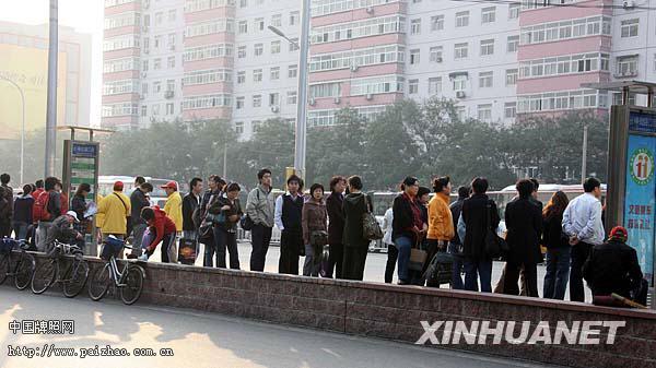 10月13日,选择乘公交车出行的北京市民排队等候公交车。