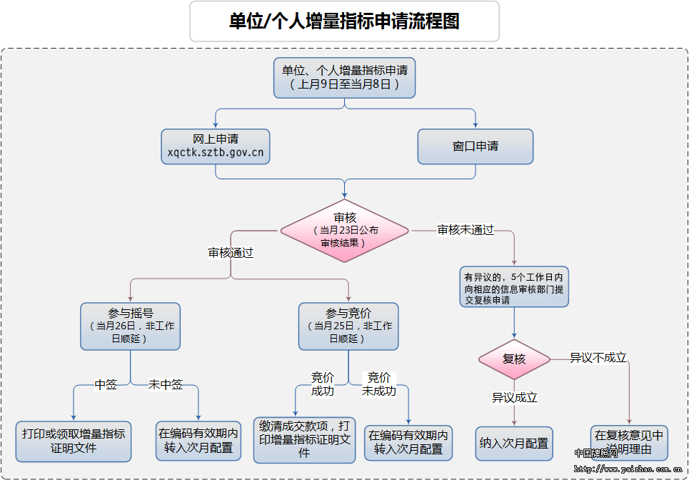 1.本市户籍人员; 满足以上条件后即可选择摇号或竞价申请方式: >>深圳汽车牌照额度摇号竞标网络申请地址及流程: 个人新申请入口 [深圳]个人申请小客车指标流程 企业新申请入口 [深圳]企业申请小客车指标流程 社会团体、其他组织新申请入口 [深圳]社会团体、其他组织申请小客车指标流程 注意:保存“申请编码”便于随时查询申请状态。 >>深圳汽车牌照额度摇号竞标现场申请地址:(窗口受理时间另行通知) 注意: 个人有效编码的有效期为3个月。未获得指标的在有效期内自动转入次月。个人有效编码需要延长有效期的应当在有效期届满前,登录指定网站或者到服务窗口申请延期。编码有效期自资格再次审核通过起延长有效期3个月。申请延期不限次数,未及时申请延期的,编码自动失效。 单位有效编码的有效期至当年12月31日,未获得指标的在有效期内自动转入次月。例如,2015年5月9日已经申请摇号,到2016年1月1日则该申请的状态变为“申请已过期”,如继续申请2016年摇号的,需重新申请编码。 ![]() > > 查询审核申请结果/并缴付竞标保证金 每月23日后可查询申请审核结果 审核通过即可参加25日竞价及26日摇号(非工作日顺延一天)。 审核未通过并需要复核申请的,应当自公布之日起5个工作日内向相应的信息审核部门提交复核申请;逾期视为无异议。经复核,异议成立的纳入下一月配置;异议不成立的并告知理由。 > > 摇号或竞价 [深圳]小汽车增量指标竞价流程 [深圳]银行柜台转账缴付竞价保证金指南 [深圳]网上银行转账缴付竞价保证金指南 [深圳]竞价保证金缴付情况查询指南 获得指标配置的,申请人可登陆指定网站下载打印。 或者去服务窗口领取: 个人凭本人有效身份证件到服务窗口领取。 单位凭法定代表人或负责人的身份证明到服务窗口领取;非法定代表人或负责人办理的,还需提供授权委托书及办理人的身份证件原件和复印件。 注意:指标有效期为6个月。逾期未使用的,视为放弃指标。以摇号方式取得的指标逾期未使用的,自有效期届满次日起,两年内不得申请增量指标。 (中国牌照网编辑:KING) |
