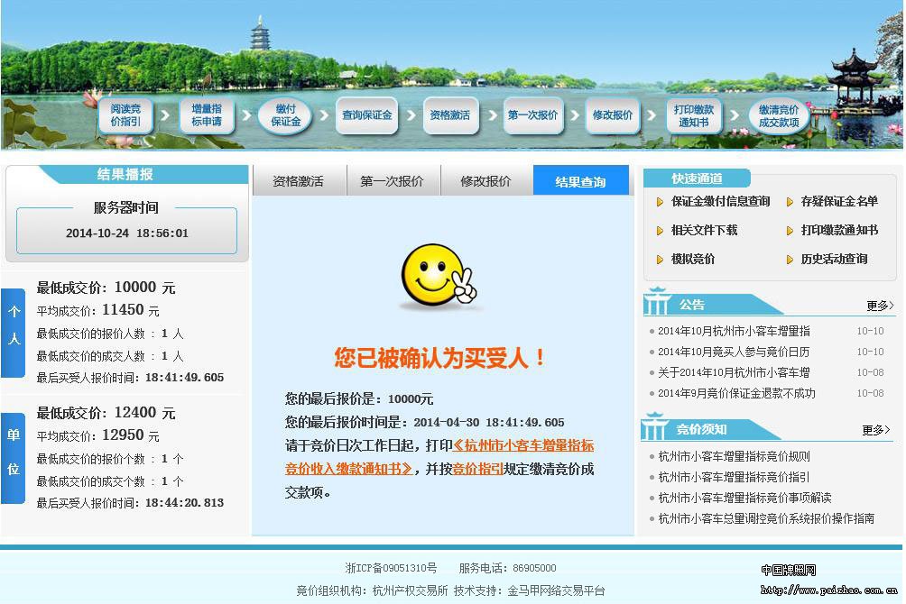 若竞买人成交,则系统给予相应提示如下图所示,请及时打印《杭州市小客车增量指标竞价收入缴款通知书》,并缴清竞价成交款项。若未成交,杭交所将按照规定退还其竞价保证金本金和利息。