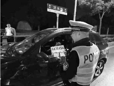 今晨0时刚过10分钟,一辆挡风玻璃上摆放着“鲁A54234(临)”的白色雪佛兰轿车在原平路、汶水路路口被设卡的静安交警支队九中队民警发现并拦下,因违反禁行标志,被罚200元,记3分。